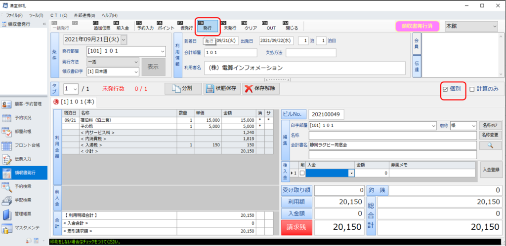 その場合、再発行だけでなく、通常の領収書発行時も個別が初期値となります。