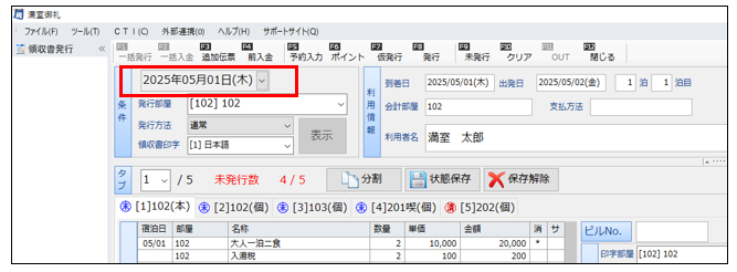 領収書画面は左上に表示している日付をみて、該当予約のその日付までの未発行分を表示します。