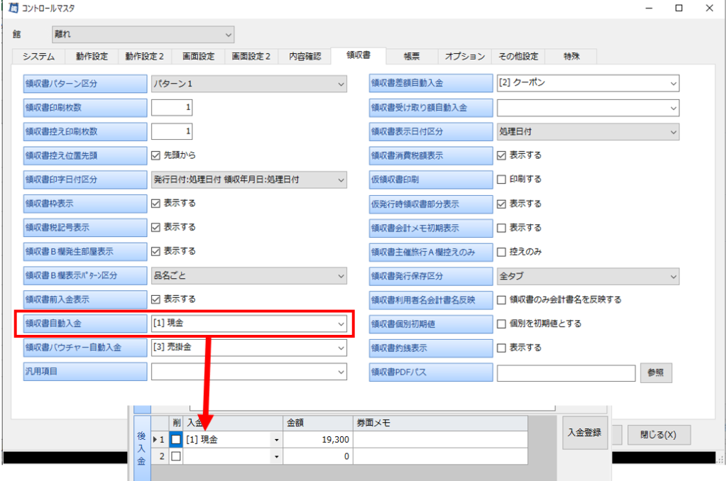「マスタメンテ」-〔コントロールマスタ〕-〔領収書〕タブ ー〔領収書自動入金〕