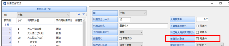 ※ 同じ小人区分でも一部単価率の反映させたくない場合は、利用区分マスタの〔単価率対象外〕に☑します。