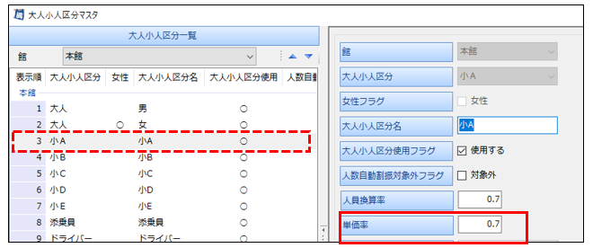 大人小人区分マスタの〔単価率〕にて、大人を「1」とした時の子供の単価率を登録します。