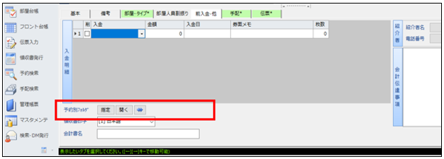 予約入力画面の「前入金・他」タブの下段にある、〔予約別フォルダ〕にてファイルを格納できます。