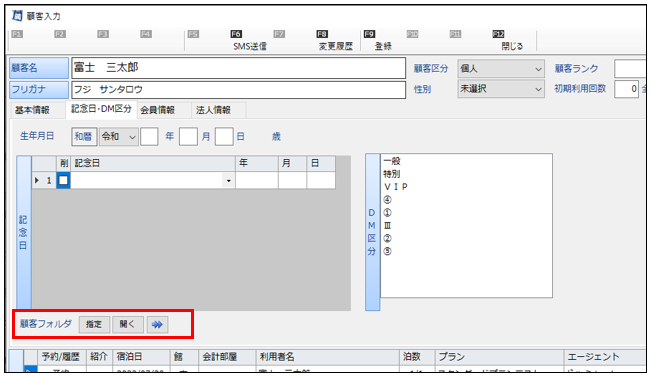 顧客情報画面の「記念日・DM区分」タブの〔顧客フォルダ〕にてファイルを格納できます。