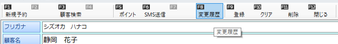 該当の顧客情報を開き、上段の[変更履歴(F8)]から顧客情報の履歴をご確認下さい。