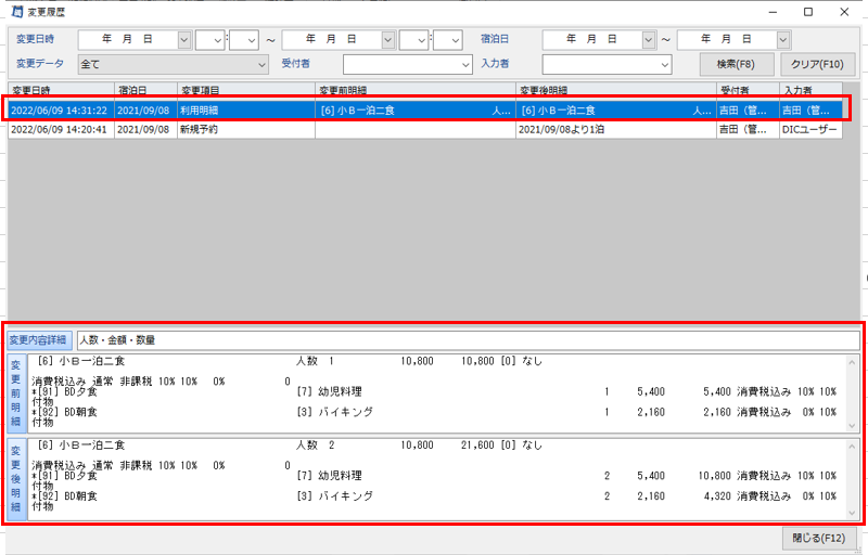 1.該当の予約入力を開き、上段の[変更履歴(F10)]から確認できます。