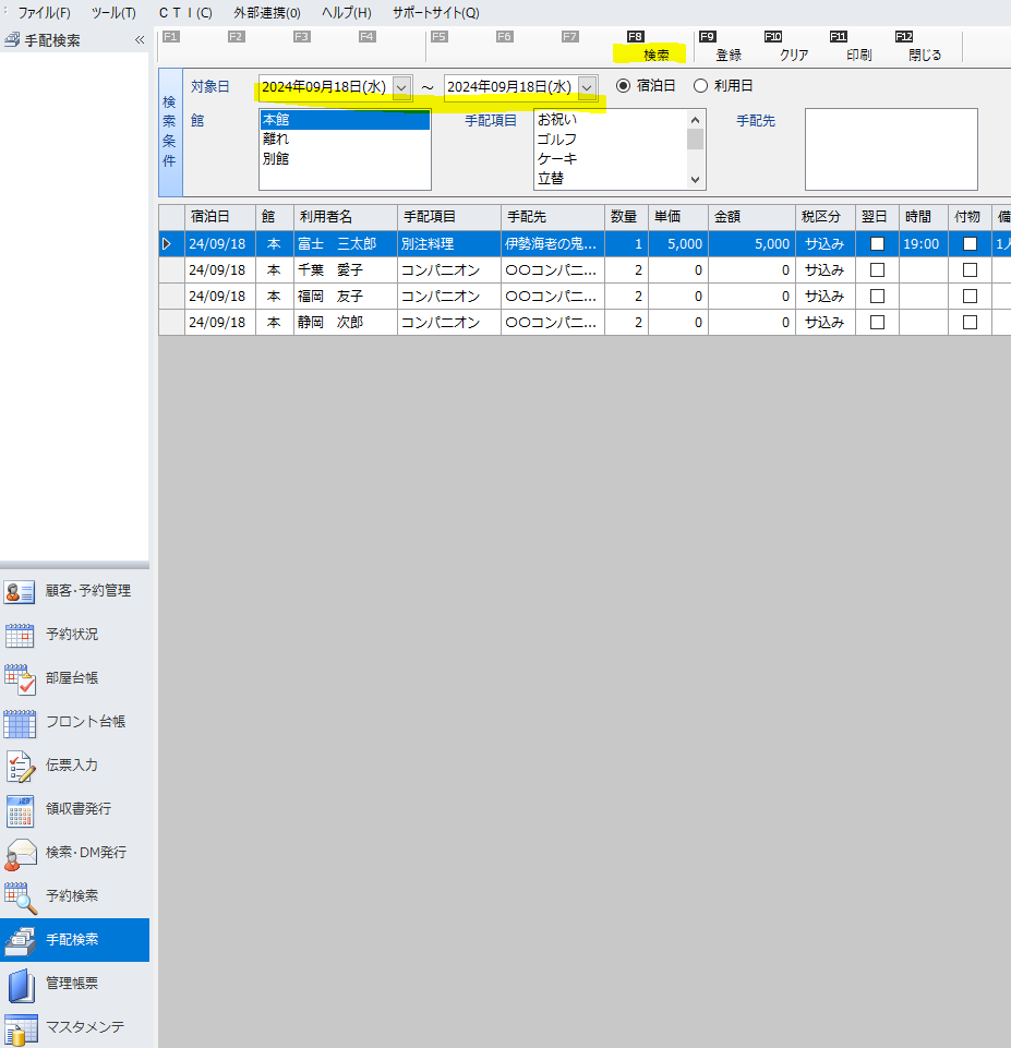 外部(花・ケーキ等)、自社(別注料理等)の手配を登録しておくと、「手配検索」または管理帳票の「手配リスト」で手配状況の管理が可能になります。