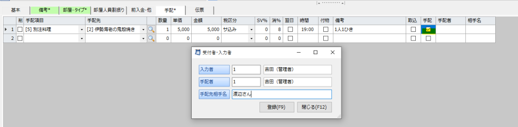 該当の手配の〔手配〕欄に☑をし、[登録](F9)をクリックすると、下図のように「受付者・入力者」画面が表示されます。誰が受けて、誰が手配をし、相手のお名前を登録することができます。