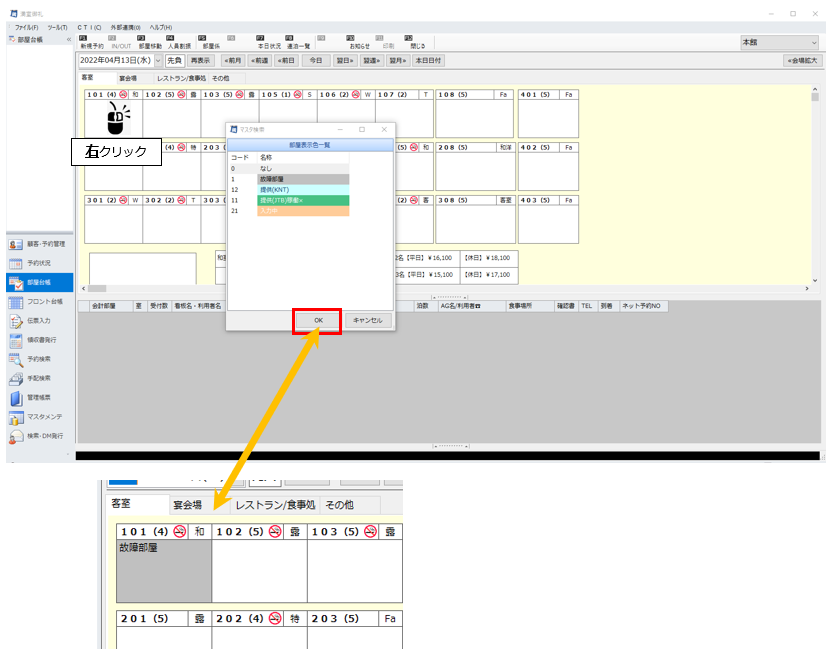 部屋表示色マスタ設定によって、色付けした部屋に予約入力を不可とすることも出来ます。