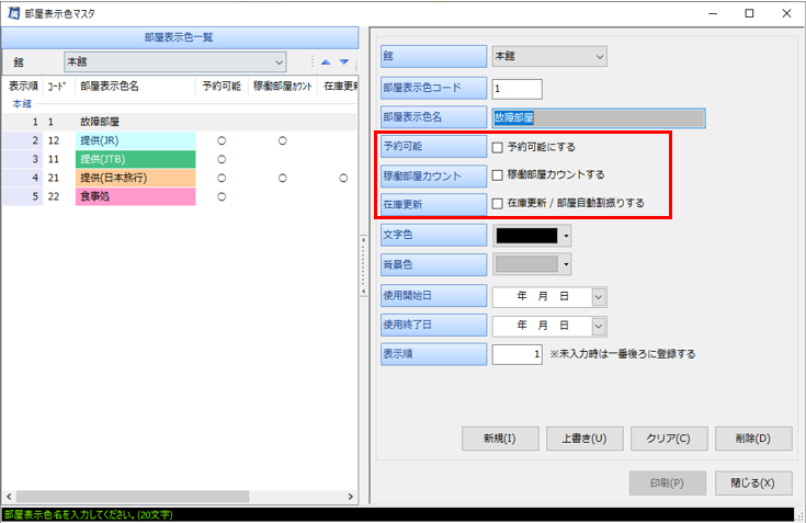 「マスタメンテ」-「部屋表示色」で必要事項を設定します。
