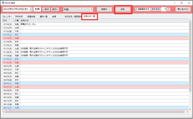 「見るだけ画面」から一覧で確認・印刷することが可能です。上段メニューの〔ツール〕-〔見るだけ画面〕から「お知らせ一覧」を表示して下さい。