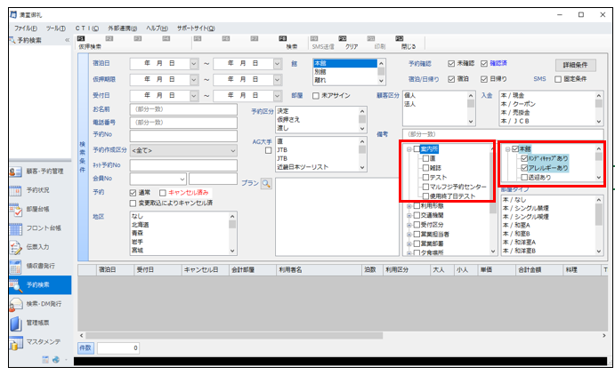 予約入力で登録した〔付帯〕や〔予約時確認事項〕での検索は、下図の赤枠内で検索可能です。