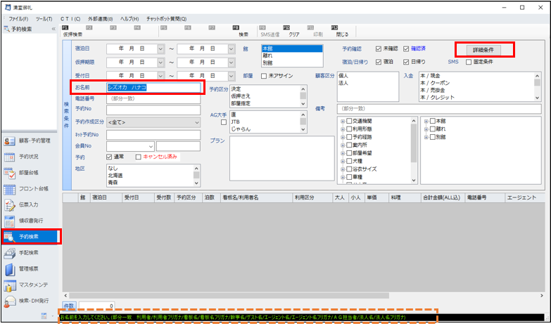 〔お名前〕項目には、エージェント名・幹事名・ゲスト名を入力しても該当の予約が検索されます。